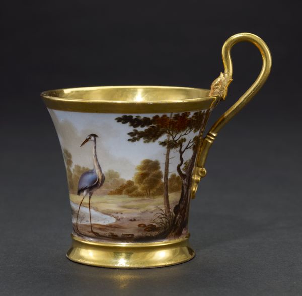 Editor: So this is a Creamer from a tea service for twelve, crafted around 1807 or 1808 by Christophe-Ferdinand Caron. It’s ceramic, with these delicate tempera paintings – a miniature landscape, almost dreamlike, wraps around it. I’m struck by how such a functional object becomes this portable piece of art, but it is also really shiny and kind of gaudy. What strikes you most about it? Curator: Gaudy, perhaps! But think of the light dancing on its surfaces in a grand salon! To me, it sings of Neoclassicism's refined elegance, wouldn't you agree? A landscape distilled to its most picturesque essence. Look how the artist uses light to create depth. Imagine holding this in your hand, feeling the coolness of the porcelain...Do you feel as though it is speaking about wealth and privilege? Editor: Definitely opulent! The gilded details feel so extra, especially the tiny dots near the spout. I get that it's trying to be refined, but I keep coming back to almost cartoonish depiction of the natural landscape. Is it the proportion or medium that it throws me off? Curator: Perhaps the tension between high art aspirations and everyday object is precisely the point? A playful subversion, perhaps, hiding within elegance? Consider that such landscapes were more commonly seen on large canvases displayed in the palaces of Kings. This creamer allowed you to take it home to your parlor. Wouldn't that be subversive? What sort of subversive item can we buy for the home today? Editor: Wow, that really shifts my perspective. I was too focused on my modern sensibilities, I guess. That everyday elegance does give it this unexpected appeal – like having a tiny, rebellious painting right at your tea table. Thanks! Curator: My pleasure! Art's like that, isn't it? A constant conversation across centuries. I think my modern subversive object to keep the playful home appeal, I might have to find a decorative tea towel!