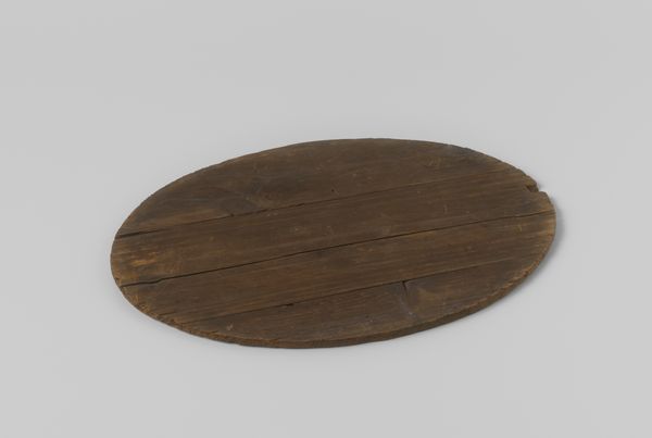 Curator: Here we have a piece titled "Paneel horende bij een achterglasschildering," essentially, "Panel belonging to a reverse glass painting," dating roughly between 1795 and 1899. It’s crafted from wood and takes on a simple, oval form. Editor: Well, my first thought? That’s… strangely compelling. It's a very basic form and material. There's a warmth to the color and wear marks; almost inviting. It reminds me a little of an old wooden shield from childhood stories, perhaps used by garden gnomes for defense against rogue slugs! Curator: Intriguing analogy! It is interesting to consider how the materials contribute to this impression. As part of a reverse glass painting, this panel acted as a support structure but also contributed to the final aesthetic and integrity of the artwork, undergoing distinct phases of labor to prepare its surface, receive the painted glass, and protect it from environmental pressures. How does its age, indicated by its textures and surface, enhance its historical significance? Editor: Its "surface" reminds me of weathered hands of time – lines of a tree revealing its history, a life of purpose, an art companion, of stories never told! It suggests secrets or hidden depths. Its simplicity almost forces one to invent the story, wouldn’t you agree? What kinds of stories might have been displayed? Religious figures? Popular allegories? Royal personages? Curator: Indeed! In this historical period, reverse glass paintings ranged from devotional images for homes to depictions of genre scenes aimed at bourgeois tastes. By viewing such pieces in conjunction with their back panel, we understand that folk art often incorporated salvaged resources or less valued materials in creating new aesthetics outside elite institutions, making something functional that also embodies spiritual, political and communal meanings! Editor: Thinking about its history, this panel evokes more of the story it once helped present—a tale waiting to be rediscovered behind the remnants of art itself! It carries a narrative charge I hadn't expected. This old oval shape stirs emotions within the modern observer and evokes ancient origins—both a door and shield against perception! Curator: Your impressions resonate with the materiality in view! Looking closely helps to grasp better this wooden panel beyond pure abstraction or utility because it contains the imprints from human effort towards producing or appreciating imagery that meant a lot within its specific historical situation. Editor: Definitely gives food for the imagination—quite different in a gallery space that holds a whole collection and so many interpretations open.