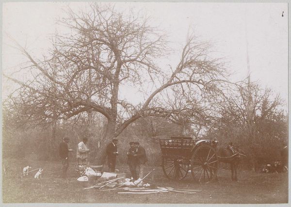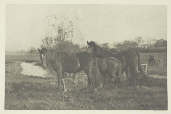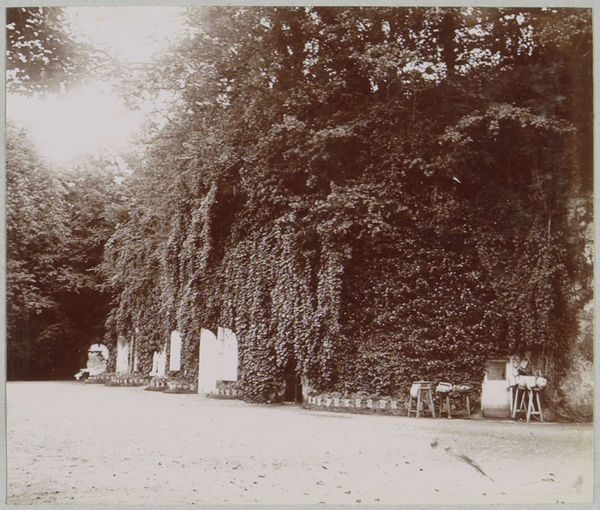 Curator: Welcome to the Rijksmuseum. Here, we’re observing a photograph entitled "Landschap met koeien aan de oevers van een beek, vermoedelijk bij Lisieux," taken around 1897-1898. Editor: It evokes a quiet stillness. The cows clustered by the stream, almost swallowed by the tall grass and hazy light…it feels very pastoral, very…unburdened. Curator: The photograph exemplifies Impressionistic tendencies, specifically in landscape photography, wouldn't you say? The tones, the textures… the focus seems secondary to capturing a sense of place. Photography was going through its own sort of material experiments at the time. The chemicals, the papers used…each impacting the image in specific ways, pushing it from pure document into art. Editor: I’m struck by the symbolic weight of the cow here. Cows often symbolize nurture, abundance. But within this somewhat ethereal, washed-out scene, there's a sense of quiet observation, perhaps even melancholy. They also act as guardians within a landscape. It feels like a study of memory or a fading way of life, with those wispy trees acting as silent observers. Curator: Fascinating. Considering this would have been near the turn of the century, that “fading way of life” takes on new importance. These farms and pastoral scenes provided resources to entire communities; now captured, as a photograph, consumed for something beyond mere practicalities. Even the albumen print process employed to develop this image impacted its legibility as history versus artifact. Editor: I’m drawn to how the photographer uses the interplay of light and shadow. It reminds me of Arcadia, that mythic place. It speaks of a longing, and an appreciation for natural beauty at a time when industrialization was transforming Europe and threatening tradition. Even now it seems a powerful symbol, for longing of something we could not get back, not for money or progress. Curator: This image leaves us considering the shifting material circumstances that make such an image valuable in the first place, don't you agree? Editor: Indeed, It highlights our perpetual longing for simpler, idyllic connections to the natural world.