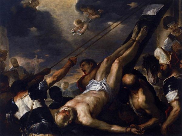 Editor: Standing before "The Descent from the Cross," painted around 1650 by Charles Le Brun using oil paints, I'm immediately struck by the dynamism. The diagonal composition creates a sense of movement and unrest, yet there's also a clear organization of figures. What formal qualities do you see at play here? Curator: The Baroque style is evident, particularly in Le Brun's use of light and shadow – chiaroscuro, as it is called. Notice how the strong contrasts define the figures and create a dramatic effect. Consider also the organization: how does the artist structure the composition? Editor: I notice the body of Christ acts as the central point, a pale form against darker shades, but my eye is led around by the colours. There's a definite rhythm to it, but it also feels theatrical. Curator: Precisely. The theatricality derives not just from the composition, but the gestures and expressions of the figures. Note the faces; how their expressions emphasize emotional impact, or rather, an interpretation of the suffering. Would you not agree? And what of Le Brun's colour palette? Editor: The reds and blues provide vivid contrasts but, again, are structurally sound choices, drawing the eye from left to right, and unifying each area within the pictorial space. The details are almost too real; it gives the scene a sense of palpable depth and three-dimensionality. It does feel intentional, a tool the artist uses to enhance the viewing experience. Curator: Indeed, it is in these arrangements that we perceive meaning. The painter creates the framework to engage his viewer on a deeply emotional level, using formal devices like colour and form, but these tools should be considered within a broader interpretive context. It's not just a narrative of sorrow; Le Brun uses colour, light, composition, to enhance the overall expression. Editor: Thank you, I’ve gained such a better understanding, seeing how even colour relationships underscore the deep sorrow portrayed.