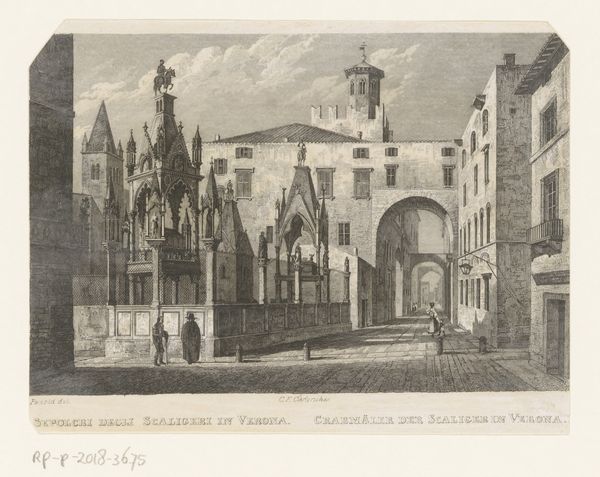 Editor: This is "Gezicht op de Bodleian Library gezien vanaf het binnenhof, te Oxford," or "View of the Bodleian Library from the courtyard, Oxford" created in 1707. It's an etching and engraving. What strikes me is how meticulously the architecture is rendered. What do you find most interesting about this depiction of Oxford? Curator: I’m drawn to what this image tells us about the relationship between knowledge, power, and public space in the early 18th century. This isn't just a picture of a pretty building; it's a carefully constructed representation of a center of learning. Notice the figures populating the courtyard – who do you think they were? Editor: Probably scholars and students. I'm thinking, how accessible would a place like this have been at that time? Curator: Exactly! These institutions were shaping the intellectual and political elite. This print makes that visible and even aspirational, in a way. The very act of creating and distributing an image like this signifies a desire to project a certain image of Oxford to a wider public. Consider how such imagery contributed to shaping social perceptions of academia. Editor: So, this print is as much about creating a public image of Oxford as it is about the architecture itself. Curator: Precisely! How do you think similar institutions are represented in images today? What visual strategies do they use? Editor: That’s a good question! I hadn’t really considered the image itself as a statement about power and access. Curator: Looking at art through a social lens opens up those questions.