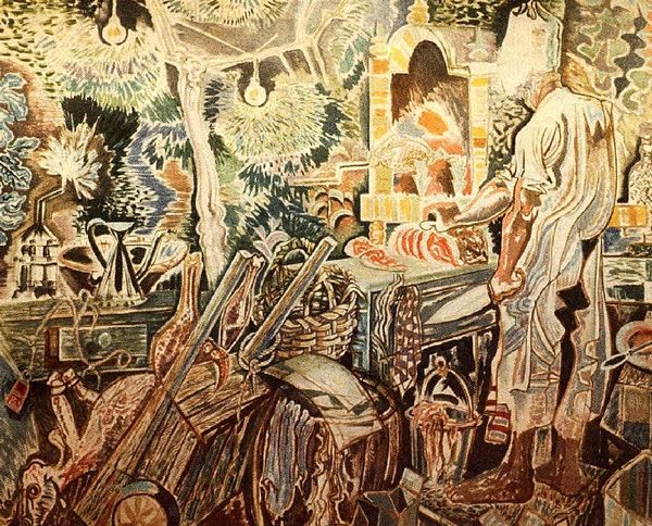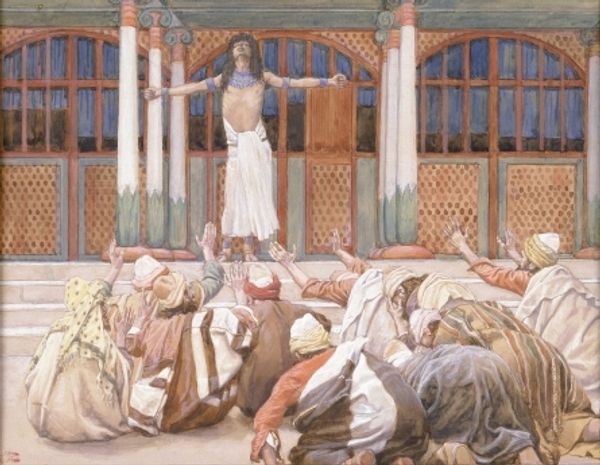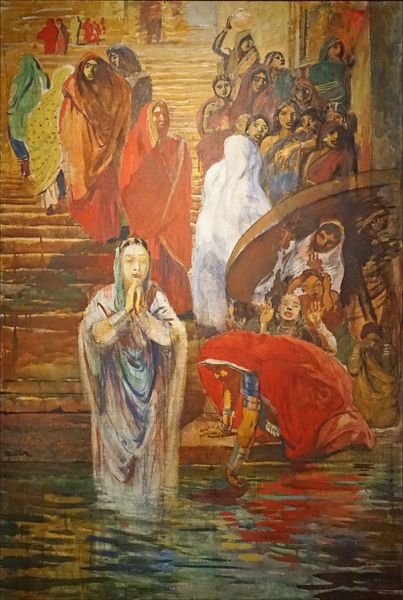 Curator: Looking at "The Progress of Medicine in the Philippines" by Botong Francisco, painted in 1953, one is immediately struck by its narrative density. Editor: Yes, it has a weighty feel, almost like gazing through a sepia-toned window into the past. The figures are monumental, creating a scene that feels both epic and intimate. Curator: The composition unfolds across multiple registers. Observe the layering, where Francisco positions figures in both the foreground and background, connected by visual pathways. Consider the chromatic scale and how he modulated the color in successive applications. Editor: Iconographically, I see a clear progression depicted. The painting appears to chart the evolution of healthcare practices within the Philippines, beginning with what seems to be traditional healing and moving towards modern medicine, evidenced by the figures representing healers. Curator: Precisely. Note how the figures are rendered—the intentional flattening of forms and the deliberate lack of perspective are crucial to the image's two-dimensionality, thus enhancing the monumental effect. The image becomes less illusionistic, more like a tapestry of sorts. Editor: And yet, within this formal construction, lies an exploration of Filipino identity and cultural memory. I'm particularly drawn to the characters seemingly based on ethnic tribal attires juxtaposed against figures resembling more conventional or modern characters, creating a potent representation of cultural change. Curator: Consider too, the interplay between line and shape—the crispness of certain contours versus the blending of colours—which constructs the scene. It reveals how Botong synthesises elements of both Western academic training with indigenist art, offering viewers a nuanced composition to decode. Editor: Indeed, seeing the various stages or evolutions depicted together symbolizes more than just progress in medicine. It acts as a visualization of national evolution and an intriguing reminder of historical turning points, each medical advance embodying broader cultural shifts. It feels powerful, almost like an assertion. Curator: I concur, such careful layering produces an enriching picture plane and makes "The Progress of Medicine in the Philippines" quite a visual masterpiece in Philippine Art. Editor: An artwork ripe with symbology and visual depth that speaks to broader historical contexts of cultural assimilation.
