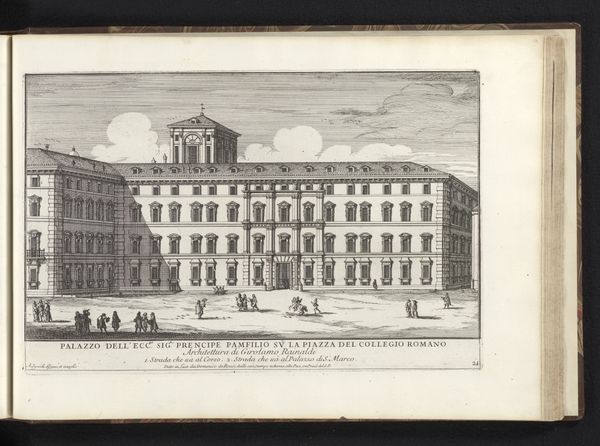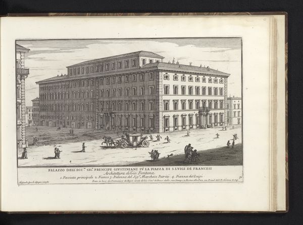 Curator: Oh, wow, it feels incredibly precise. The etching work is astounding in its detail. So clinical! Is it meant to celebrate architectural vision or...document it almost forensically? Editor: This is "Palazzo Salviati alla Lungara," an engraving by Alessandro Specchi, dating back to 1699. What strikes me is how it captures a moment when urban development itself was a form of political statement. Here, we're not just seeing a building, but Rome itself being reshaped. Curator: Politically charged floorplans! That's intriguing, it feels almost impossible in our context today...Do you think there's any play of reality in the depiction, like embellishment of how populated this square actually was? The scattering of tiny human figures and horses…it looks a touch idyllic. Editor: These cityscapes served as powerful marketing tools, projecting an image of Roman grandeur. Note the facade, rendered with unwavering accuracy. Each window, column, and balustrade contributes to a calculated image of power. The artist really commits to selling a very specific picture. Curator: You know, thinking about it now... I find a strange beauty in its rigidity. It’s a blueprint come to life. Like gazing into the mind of someone obsessed with order, which is probably what you needed in the Baroque period? Editor: Exactly. The Salviati Palace would have stood as a very visual embodiment of the family's status and influence within Roman society. This print ensures the building’s magnificence can be circulated and appreciated even by those who never set foot in Rome. Curator: Almost like influencer marketing of the Baroque, social climbing through engraving... Now I’m starting to imagine all the backroom deals that must’ve led to the palace getting built in the first place. Makes the clean lines feel way less innocent. Editor: Well, it serves as a reminder of the intricate dance between art, power, and the ever-evolving urban landscape. I find this image particularly pertinent in how such visual documents help shape historical narratives and collective memory. Curator: Looking at this work it feels like witnessing not only the façade of a palace, but also of a very tightly controlled version of reality and what it takes to communicate one idea of a patron to the broader public. Editor: Indeed. Each line and shadow are very thoughtfully put in place to speak volumes about 17th-century Roman ambitions.