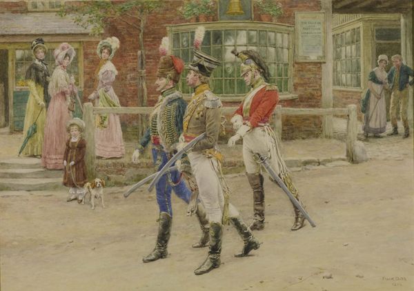Curator: I find myself drawn to the subdued hues of this watercolour illustration, its atmosphere conveying a hushed expectancy amidst the violence it implies. There’s something incredibly haunting and poignant in its seeming quietude. Editor: Indeed. The artwork, titled "A rest during the bullfight", was created in 1881 by the Spanish artist Joaquín Agrasot. It's an interesting genre piece, capturing a moment of respite amidst the drama and spectacle of the bullring. It seems the piece offers us access to what is taking place behind the scenes, even beyond the bullfight itself. Curator: Right, there's this almost eerie tranquility to it. I can almost hear the quiet murmur of conversations. There's something very contemporary about how Agrasot seems to capture not the bullfight, but the in-between moments of that performance. Do you think there is something about contemporary culture that continues to inspire our fixation with such brutal performative activities? Editor: It's difficult to say if Agrasot’s work here might comment on this fixation you discuss. However, it is hard to ignore the work's relationship to portraiture, which historically tends to create lasting gazes on specific actors of our cultures, usually men. To focus the historical importance of portraiture on this piece, the work makes commentary about gendered power relations in late 19th century Spanish culture. Bullfighting, as a practice, does operate within similar hierarchies of power and gender. Curator: Hmmm, while I can see the artist using those tools, in portraiture and genre painting traditions, to signal masculine identity construction, I think the work's real pull lies in the sense of fleeting moments. We catch this pause, before those shown in the work will resume performing very carefully designed, sometimes violent and terrible, feats. Editor: That temporality certainly complicates it, doesn't it? Perhaps Agrasot encourages us to consider that identity itself, even power and brutality, is itself transient. A worthwhile idea that invites us to engage with his painting.