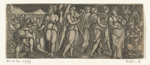 Curator: Let’s turn our attention to "Four Roman Figures," a drawing created with pencil, pen, and ink on paper in 1781, by Philippe Louis Parizeau. Editor: Immediately, I’m struck by the stark contrast. It's such a delicate work on paper depicting these imposing historical figures, there's almost a contradiction built in. Curator: It's interesting to think about that tension. What we are seeing, I believe, is a dialogue with the cultural memory of the Roman era – those figures act as emblems loaded with symbolic value, a golden age, transmitted and translated here into the Enlightenment. Editor: And yet, the means of transmission are so humble. This isn't marble sculpture, it's lines on paper, created using tools and processes accessible even then, which contrasts with the monumentality the artist wants to convey, perhaps reflecting new ideas of artistic value. Curator: Exactly, notice how Parizeau uses classical realism to invoke their character and moral value: we see knowledge, harvest, law, strength - perhaps four cardinal virtues or a depiction of the seasons. The choice to portray them using ink suggests something ethereal or fragile. Editor: This is what I like about focusing on the medium. The Romanesque style, normally grand, becomes fragile. And what about the process? Was it laborious? Quick? We can only guess how the paper felt in his hand. Did that texture suggest an aesthetic? These questions make the work of art become grounded and palpable. Curator: I can appreciate your material interpretation. Considering its historical context within the Enlightenment era allows one to think of this work as less about pure emulation, and more about an emerging identity building its heritage, constructing its future, through powerful visual imagery. Editor: Thinking about the labour of image making makes this less precious for me, connecting it to wider crafts practices instead, demystifying its supposed genius, without robbing it of any emotion.