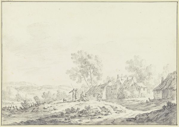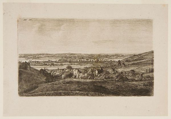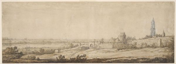 Curator: William P. Sherlock’s wash drawing, “Wide Landscape with Lake in the Middle Distance,” captures a sweeping vista. What’s your first take on it? Editor: Bleak but serene. I see a landscape that’s both inviting and desolate, a testament to the British countryside during a time of immense agricultural change. Curator: Note the sepia wash, likely iron gall ink. Its pervasive use speaks volumes about the materials readily available and culturally favored for landscape sketching at the time. Editor: Sepia evokes a sense of nostalgia, doesn't it? It also speaks of transition. The distant lake, the fields—symbols of both promise and the relentless march of time. Curator: Indeed. The very act of rendering such an expansive view suggests a preoccupation with land ownership and its representation during the late 18th and early 19th centuries. Editor: I see echoes of the Picturesque movement, though with a somber tone—a subtle commentary on man's relationship with nature, represented through controlled ink washes and expressive line work. It also speaks of the value of the land. Curator: Precisely. Consider how the artistic practice was tied to the socio-economic landscape; Sherlock's work highlights the materials of art as embedded within a system. Editor: A melancholy reflection then—the cultural weight of land and its image made tangible.