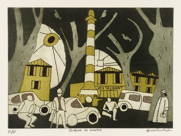 Curator: Julian Trevelyan's "Nimes" presents us with a compellingly stylized cityscape. I find its composition unexpectedly serene. Editor: Serene, perhaps, but also consciously constructed to evoke a sense of theatrical artificiality, a stage for urban life. Curator: I agree, the flattened perspective and limited palette emphasize form over representational accuracy, a deliberate choice on Trevelyan's part. The building almost looks like a backdrop. Editor: Indeed. Given Trevelyan's deep engagement with Surrealism, and his understanding of how art can depict the city, the chariot and figures feel less like historical accuracy and more like actors on a stage set. Curator: Yet, there is a playful tension there. The building's weightiness is both structural and symbolic. A fascinating piece. Editor: Absolutely, it leaves one contemplating the relationship between perception, history, and image.