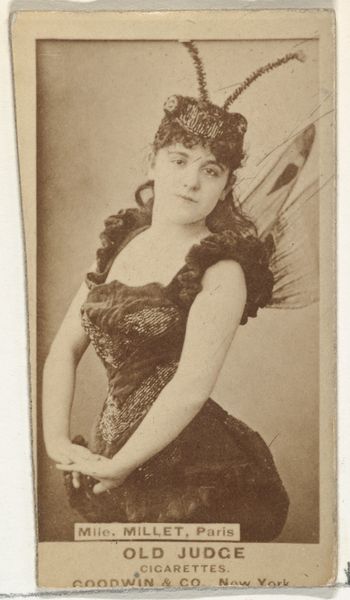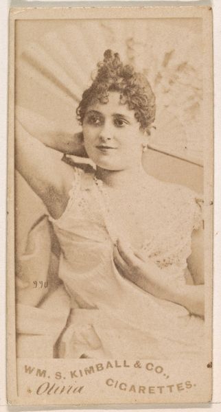 Editor: Here we have "Mrs. Hamer" from the "Actors and Actresses" series, made by Allen & Ginter between 1885 and 1891. It looks like a photograph, now at the Metropolitan Museum of Art. There's a quiet strength in her gaze, but the image feels...commodified, somehow. How do you interpret this work within its historical context? Curator: This is one of many cards from that era using actresses as advertisement, effectively reducing them to products to be consumed. It reflects the burgeoning consumer culture and the objectification of women, particularly performers, that was becoming increasingly prevalent. The gaze you identify – does it strike you as complicit, defiant, or something in between? Editor: I hadn’t thought of it that way, but now that you mention it, it seems almost a forced, serene pose, trying to mask any inner conflict. Is that a common reading? Curator: Many scholars now examine these images through a feminist lens, recognizing how such photographs contributed to the construction of celebrity and gender roles at the time. These weren't neutral depictions; they actively shaped perceptions. Consider, too, that Mrs. Hamer's livelihood depended, in some measure, on her public image and willingness to participate in such promotions. What tensions arise when we juxtapose personal agency and structural constraint? Editor: So, it’s not just a pretty picture. It's loaded with commentary about gender, labor, and consumerism. Curator: Precisely! Understanding those intersections gives the artwork much more depth and contemporary relevance, and challenges viewers to consider the role that images play in our culture even now. Editor: I’ll definitely look at these kinds of images differently from now on. Curator: That’s the aim - to see with new eyes, informed by historical understanding and a critical perspective.