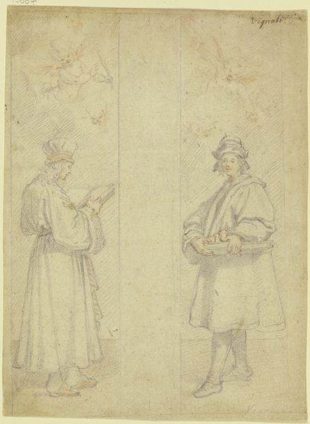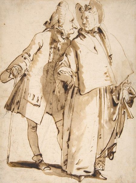 Editor: This is Joseph Andrews' drawing, "Parson Wells and his Wife." It's a lovely, delicate sketch. What strikes you about the material qualities of this piece? Curator: The linear quality invites us to consider the costuming. What materials would have been available, and how would the garments have been made? We can also consider the cost of the paper and drawing tools themselves. These speak volumes about social status. Editor: That's fascinating! I hadn't thought about the material implications of the clothing in that way. Curator: It encourages us to understand the economic realities shaping their portrayal. Food for thought!