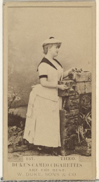This calling card, titled Theo, comes from the Actors and Actresses series (N145-7), issued by Duke Sons & Co. to promote Duke Cigarettes. A photographic print on card stock, this small rectangle represents a seismic shift in production. Before photography, promoting anything required skilled labor – painters, printers, engravers. But with the advent of photographic printing, the means of production entered a new era. A single photograph, easily reproduced, could now reach a mass audience. Look closely and you'll see the tones, the textures, and the light. These qualities, once painstakingly rendered by hand, are now captured chemically. The production of these cards created a demand for new kinds of labor, from photographers to factory workers who mass-produced and packaged the cards. These cards are a material reminder of a world transformed by mass production and the rise of consumer culture. They invite us to consider the relationship between art, commerce, and the changing nature of work.