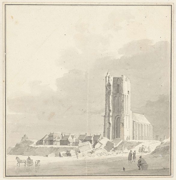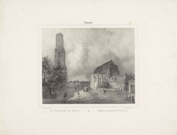 Curator: Immediately, I'm struck by the almost photographic detail in this engraving; the water is incredibly serene, and that architectural spire—imposing, almost dominating. Editor: This is "View of the Oude Gracht in Utrecht," dating back to 1830, created by Reinier Craeyvanger. It is an engraving that belongs to the Romantic movement. But seeing it now, I am most drawn to how the architecture interacts with the natural elements— the trees, water—to define the landscape. Curator: The skyline indeed presents a striking contrast. The Oude Gracht was such an important feature in the lives of local Utrechters; how were women represented or unrepresented within its economic and social landscape? How did it function in women’s daily routines and power dynamics, for instance? We are given few cues from this print—or are we? Editor: I see that point; what might be deemed “quiescent,” though, also presents rich lines, shapes, and textures, the visual architecture that underlies the work's themes. Let’s consider the engraving itself; the medium reinforces the clean lines and sense of precise architectural record. The composition's emphasis on verticality with the cathedral—it is clearly about symbolic power. The clouds above contribute to that mood. The engraver’s decisions—how did those impact this print and reception to it? Curator: Certainly, we can engage how Craeyvanger’s formal decisions intersect the role of religion in the Netherlands and in Utrech specifically at the time; religious architecture carries so much weight during the time as the old ways are contested by growing ideas around humanism. How might locals respond to this print, especially regarding religious iconography in civic life? The people present seem quite small... Editor: But active, no? Not merely diminutive. Look at how they traverse the scene via water, and are scattered around town… It creates a pulse of activity and invites the viewer to witness a fleeting sense of bustling daily life of its local folk. Curator: A valid formal analysis. Thinking about its cultural impact, though, allows us to understand Romanticism's preoccupation with landscape as something politically potent, a negotiation of the sublime within a changing, contested public sphere. Editor: That’s fascinating, and in considering this engraving’s lines, shape, and use of shading, I better see this interpretation… Thanks to its details, we both gleaned richer insights on art, power, and place!