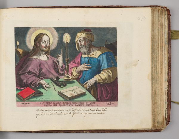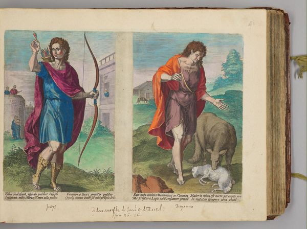 Editor: This bound sheet features hand-colored engravings of Saint Bartholomew and Saint Matthew by Anton Wierix II. I’m really struck by the contrast between the serene figures and the violent scenes behind them. What do you see in this piece? Curator: Well, I'm drawn to how Wierix combines the monumental and the miniature. These saints, icons of faith, are set against chaotic landscapes, a world grappling with belief. It's as if the artist is asking, "Where does holiness reside amidst human conflict?" Editor: That's a powerful question. The engravings feel so detailed, yet the overall impact is almost dreamlike. Curator: Exactly! It's a testament to the artist's skill, creating intimacy with the saints while hinting at a much larger, complex narrative. I wonder what a scholar of Wierix would make of that. Editor: Definitely gives me something to think about. Thanks! Curator: My pleasure!