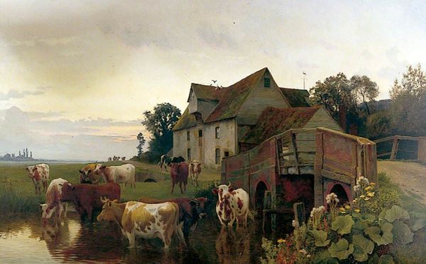 Editor: We're looking at Edward Hicks's "Residence of Thomas Hilborn," painted in 1847, an oil painting depicting a farm. It has a sort of naive charm, almost like a folk-art rendering of rural life. How do you interpret this work? Curator: Well, beyond the immediate charm, I see a layered commentary on labor, land ownership, and perhaps even the myth of the American pastoral ideal. Hicks was a Quaker, and his faith deeply influenced his art. Do you notice the detailed depiction of different forms of labor—the plowing, the tending to animals, the domestic scenes? Consider whose labor is being valorized and whose might be erased. Editor: I see what you mean. It seems to show a balanced, idealized view of work. The focus is on a white family; it prompts the question: whose stories aren't being told here? Curator: Exactly! That absence is critical. Ask yourself, who historically benefited from this pastoral landscape? Whose backs built these farms? Where is the acknowledgement of Indigenous dispossession, or the reliance on enslaved labor that underpinned much of early American agriculture? This painting offers a romanticized view, but by acknowledging its omissions, we can begin a more critical dialogue about history. It is a view, or a vision, in a specific context that favors some to others, at a specific point in time. Editor: So, understanding what's *not* shown is just as important as what *is*? Curator: Absolutely. By juxtaposing the idyllic surface with the realities of the time, we can unpack the complex, and often contradictory, narratives embedded in American art. We see through rose-tinted glasses. Editor: I hadn't thought about it that way. It really opens up the painting to a much deeper conversation about American history. Curator: Indeed. Art is never created in a vacuum. Questioning its context is an ongoing, ever necessary process.