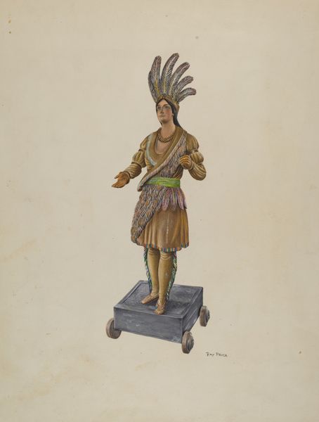 Editor: Here we have Lucille Lacoursiere’s watercolor on paper, "Cigar Store Indian," from around 1938. It's quaint, almost like a naive rendering. What do you see in this piece? Curator: It's impossible to ignore the loaded history of these cigar store figures. They are undeniably a symbol rooted in cultural appropriation and the romanticized, often dehumanizing, depiction of Indigenous people. This work then exists in this tension: on the one hand we have an Indigenous artist recreating this imagery. How can we interpret this image when considering issues of identity, race and representation? Editor: So, it's not just a picture, it's about all those historical layers and assumptions? Curator: Exactly! We must consider the historical context of exploitation and the commercial use of Indigenous images to sell products. What does it mean to reclaim or re-present those images through an Indigenous lens? Is Lacoursiere reclaiming this image, critiquing it, or perhaps something else entirely? What do the specific aesthetic choices—the style, the medium—tell us? Editor: It almost feels like a flattening, like the artist is turning a three-dimensional object back into a two-dimensional image, calling attention to the constructed nature of the cigar store figure? Curator: Precisely. What readings can be made when considering this choice, combined with its “folksy” feel, with what we know about this object? This challenges the viewer to confront the complex narrative of representation and power dynamics. Editor: I see what you mean. It’s not just a drawing of an object; it’s a conversation starter. Curator: Exactly, a starting point for interrogating historical narratives and contemporary identity. This has made me look differently at the use of Indigenous imagery, I need to learn more!