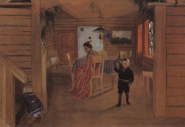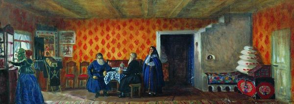 Editor: Boris Kustodiev’s 1918 painting, "Room in the House of Prokofy Pazukhin," rendered in oil paint, presents an intriguing interior scene. I’m immediately drawn to the somewhat claustrophobic atmosphere created by the textured walls and the compressed space. What structural elements stand out to you? Curator: The composition is indeed quite deliberate in its creation of tension. Observe how Kustodiev employs a flattened perspective, minimizing depth. The patterning on the walls, the stove, and the textiles compete for visual dominance. How do you think this affects the viewer's reading of the subjects within the room? Editor: It's almost as if the environment itself becomes a character, overshadowing the figures. The woman in the doorway seems trapped, while the man blends into the background clutter. But how intentional is this effect, and can we be certain of its purpose? Curator: Intention, while ultimately elusive, is hinted at through several means. Note the light; it doesn't quite illuminate, but rather diffuses across the textures, negating any focal point. Further, the artist has created patterns, but not order, creating a scene without center. Could we say the room is a metaphor? Editor: A metaphor for societal unease, perhaps, given the historical context. Still, is it right to assign a meaning, when we could simply appreciate it on the surface for its textures and colors? Curator: Certainly, one can appreciate the work on a purely formal level. However, the very choice to depict such a cluttered, psychologically charged space cannot be disregarded. Consider the heavy lines, the almost clashing use of color - they communicate something beyond mere representation. It presents itself as more than "just" an interior. Editor: I see your point. Focusing on those elements brings forward a way of viewing the painting I had not considered before. Thank you! Curator: It is my pleasure; approaching works of art in many ways allows one to grasp what their intent may mean.
