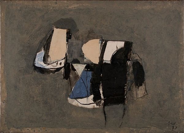 Curator: We're now standing before "Nero, verde, azzurro" by Afro, created in 1960. It’s a compelling example of the artist's work in the Art Informel movement, combining oil paint and mixed media to explore abstraction. Editor: My first impression is one of controlled chaos. It's as if fragments of color and form are barely contained on the canvas, hinting at some deeper, underlying structure. What strikes me is the materiality; I can almost feel the texture of the paint. Curator: Absolutely. Afro, born Afro Basaldella, operated in a post-war context where traditional artistic values were being questioned. The Art Informel movement itself represented a rejection of geometric abstraction in favor of a more intuitive and process-oriented approach to art-making. There's a real push towards the raw and authentic. Editor: I find myself wondering about the choices behind those heavy blacks contrasted with the lighter blues and greens. The title—"Black, Green, Blue"—feels almost too simple for the complexity we're seeing. Were these colors readily available? Did their specific pigments influence his work? Curator: That's a key point. The palette does speak to the broader social and cultural anxieties of the era. The darkness could be a reflection of post-war trauma and uncertainty, while the glimpses of brighter colors might offer a glimmer of hope or renewal. Editor: It is true that the application itself looks pretty physical; each layer of paint, each stroke and spatter contributes to the overall texture, highlighting the artist's hand and the inherent qualities of his selected materials. I'd love to see if any archival studies could shed light on the brand and manufacturer used, further showing Afro’s dedication. Curator: I think, beyond the immediate aesthetic appeal, this piece reflects a crucial moment in art history—a breaking away from traditional modes of representation and a courageous exploration of pure form and color. It prompts us to question the very definition of art and the role of the artist. Editor: Exactly, seeing this reminds us that artworks can offer important information. It can reveal subtle yet invaluable hints that contextualize the period during its making and its subsequent impact and interpretations.