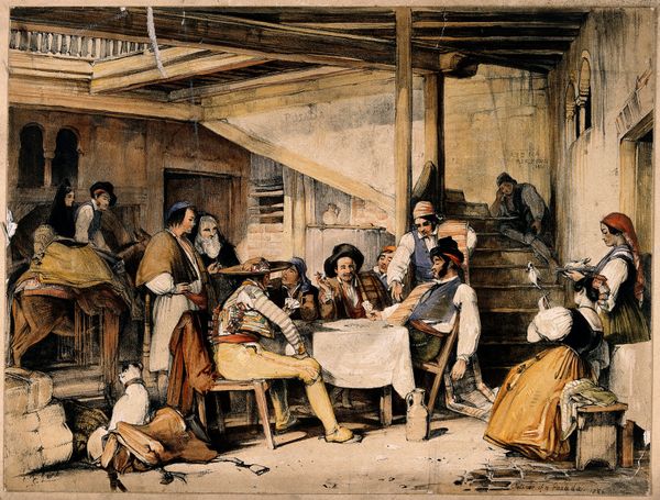 Curator: Ignatius Josephus Van Regemorter’s “The Fish Market in Antwerp,” painted in 1827, depicts a bustling everyday scene, one now housed at the Rijksmuseum. Editor: Right away, it’s striking how vividly the artist captures the energy and intensity of a busy market morning. The slightly misty light almost makes you feel the dampness in the air and smell… well, you know… fish. Curator: Absolutely, the atmosphere is almost palpable. But let’s consider what goes into such a representational work. The very nature of genre painting like this seeks to valorize labor through material honesty. Editor: Valorize, perhaps, but the grittiness here… it's not sugarcoated. The light falling on the fishmonger’s worn hands and weathered face tells a story of toil, of repetitive work. You can almost hear the haggling! It's this sense of immediacy, of truly lived experience that captivates. I'm getting caught in the scene here... Curator: Well said! And look closer at how the scene is structured. The artist employs an earthy palette: browns, greys, punctuated by the reds of some clothes or glints off silver scales of the product that is on sale. Consider also, the composition isn’t accidental, note the staging as seen from this undercroft. Editor: Staging? It’s true, there’s a certain dramatic framing, isn't there? The archway, the sky breaking through. There’s also this almost tangible layering with stalls in front, then the busy marketplace going back toward the light of the early morning sky. It's like entering the scene as a character in some drama... Curator: Which then raises the question: are we as viewers, placed comfortably distanced here on tour, implicated by observing it now? Consider what perspective does regarding social classes, and modes of display of art, of labor. Editor: Good point, indeed! All this… makes you consider art itself as being bartered and negotiated, doesn’t it? Perhaps this work has gained a certain 'value' in our current time that would not be agreed upon back in 1827. Thanks for adding all this depth! Curator: My pleasure, this was worthwhile! It's always important to remind viewers of the layered social-political components embedded in any artwork. Editor: Yes! So very true. I find myself newly attuned to those undercurrents present. Now I want some oysters...