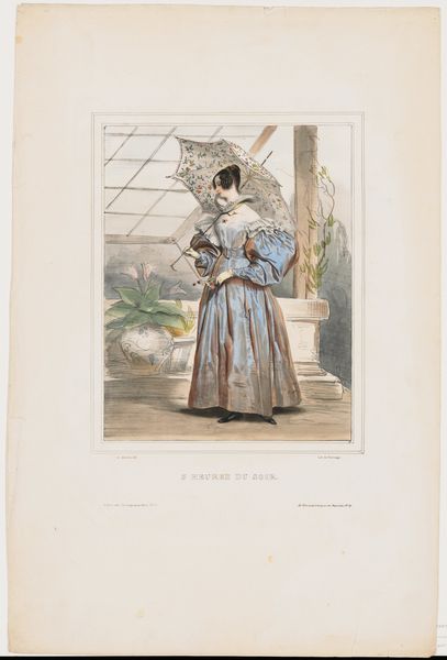 Editor: This is “Minuit. Mlle. Annette Boulanger,” a lithograph by Achille Devéria from around 1830. It's got this captivating, almost theatrical quality. I'm drawn to the figure's elegant dress, but also the way the interior setting is depicted, it seems so posed. What stands out to you? Curator: Devéria’s lithograph provides us with a valuable window into the world of Romanticism and its engagement with celebrity culture. Look at how the artist frames Mlle. Boulanger within a domestic space that hints at performance. The draped curtain, the implied audience—perhaps this is about constructing an image as much as it is about capturing a likeness. Editor: That's interesting. It's like the print is almost advertising her, but subtly? Curator: Exactly. Think about the rise of the printing press and how it enabled images like these to circulate widely. Portraits became accessible, shaping public perception. How might a piece like this reinforce or challenge societal expectations of women, especially actresses, at the time? Editor: So it's not just a pretty picture, but a form of social currency, creating and perpetuating an image? Curator: Precisely. The lithograph, therefore, operates as a complex social and cultural artifact, speaking to ideas about beauty, performance, and the increasing importance of visual representation in the early 19th century. Editor: I had never thought of it that way. It's much more than just a portrait. I appreciate understanding the context in which these images circulated. Curator: Indeed. Looking beyond the immediate beauty allows us to see the historical and cultural work the artwork performs.