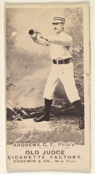Editor: Here we have an 1889 print photograph titled "Edwin Forrest 'Ned' Bligh, Catcher, Cleveland, from the Old Judge series" by Goodwin & Company. It has an interesting sepia tone that gives it a vintage feel. What strikes me most is the stark contrast in tones and the overall composition. How would you interpret it? Curator: What compels me most is the photographer's compositional strategy. Note how Bligh's extended arms create dynamic diagonals that lead the eye across the frame, contrasted by the grounding verticality of his stance and the slight upward gaze. Do you find that this play of lines creates a sense of anticipation? Editor: I think so. I notice the subject's focused expression paired with the upward gaze hints at his readiness and suggests an exciting moment about to occur in the game. Is there anything more to gather from its form? Curator: Precisely. Observe also how the photographer used chiaroscuro effects to give dimension to the Bligh’s uniform and underscore its structure. See how the strategic use of light and shadow heightens our perception, even adding visual texture to an otherwise static scene. Editor: So, through line, shape and the use of shadow, Goodwin & Company highlights movement and action. Fascinating how the formal choices truly elevate the image! Curator: Precisely. Through such devices, the image transcends mere representation to achieve an eloquent dynamism. I'm glad you observed such critical components of form and their implications.