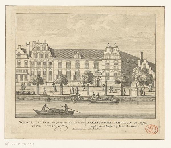 Editor: This is "Gezicht op het Diaconieweeshuis te Amsterdam," or "View of the Diaconieweeshuis in Amsterdam," an engraving from sometime between 1710 and 1766. It's quite detailed and feels very documentary. What do you see in this piece? Curator: I see a potent visual document of power and social structures. Consider the orphanage itself. These institutions weren't simply charitable endeavors. They were tools used to manage populations, control labor, and instill specific moral values in marginalized children. What narratives are missing from this seemingly straightforward cityscape? Editor: I hadn't really thought about it that way. It's just an architectural rendering to me. What missing narratives should I be looking for? Curator: Consider who benefits from the existence of such an institution, and who is confined within its walls. Look at the visual hierarchy - the imposing orphanage dominating the skyline, the smaller figures of people crossing the bridge, the Latin inscription reinforcing authority. The engraving subtly reinforces a social order. Also, whose stories aren't being told here? Where are the voices of the children, their experiences, their resistance, if any? Editor: So, it's not just about the building itself, but the power dynamics it represents? Curator: Precisely. Art, even seemingly neutral depictions like this, can reflect and perpetuate existing power structures. We need to look beyond the surface and ask critical questions about representation, agency, and social justice. Editor: That gives me a whole new perspective on historical artworks. I see the social critique within the aesthetic presentation. Thanks! Curator: It's crucial to continually interrogate these visual narratives to uncover the complex, often uncomfortable truths they contain.