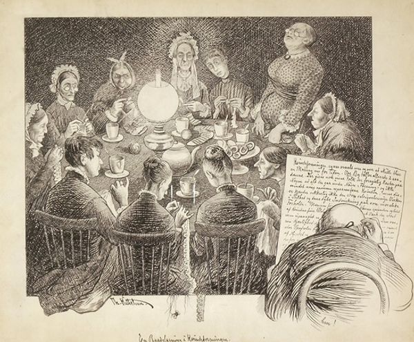 Curator: Welcome. We’re standing before Adolf Ferdinand Schinnerer’s "Das Gastmahl," also known as "The Dinner Party," possibly from 1920. Executed in ink, it's a drawing and print that pulls us into an intriguing scene. Editor: Immediately, I'm struck by the density of the composition—a mass of bodies crowded around a long table. The monochromatic palette and chaotic linework evoke a feeling of anxiety and perhaps suppressed rage. It feels very much a reflection of its time, full of the anxieties simmering post-WWI. Curator: Indeed. The application of ink, seemingly frantic, lends a raw, unfiltered quality to the depiction of this genre scene. Consider the formal arrangement: the elongated table dominates the pictorial space, serving as a stage for this ambiguous drama. Observe the contrasting light and shadow, strategically deployed to highlight key figures and gestures. Semiotically, we might interpret the table as a symbolic space of gathering. Editor: I'd argue it is less about mere "gathering" and more about power dynamics and perhaps social breakdown. Look at the varied expressions, or lack thereof. The people are rendered with a certain degree of uniformity and almost violent stylization. This was a volatile period in Germany, with economic devastation, political instability, and burgeoning radical movements on both the left and the right. It begs us to ask: Who is at this dinner? And what’s really being served? Curator: It's valid to interpret the expressions as reflecting the period's unrest. But let’s not overlook the pure compositional choices. See how Schinnerer’s use of line directs the eye throughout the tableau. The table itself acts as a structural spine, leading to the figures receding into the background, framed by architectural shapes that emphasize confinement. Editor: Confinement, exactly. I see how the space suggests societal constraints and perhaps the futility of collective action in a time of immense stress. I think we can analyze those strokes that describe surfaces to expose a specific kind of early 20th-century societal unease—to really excavate meaning. Curator: I appreciate that tension you are raising. It helps me see those intentional disruptions within the linear structure. To summarize, in his piece "Das Gastmahl," Schinnerer gives us not merely a snapshot of a meal, but a deeply felt, stylized view on post-war anxiety. Editor: Absolutely. This work serves as an unnerving glimpse into a society on edge, a visual scream rendered with a graphic intensity that is truly arresting.
