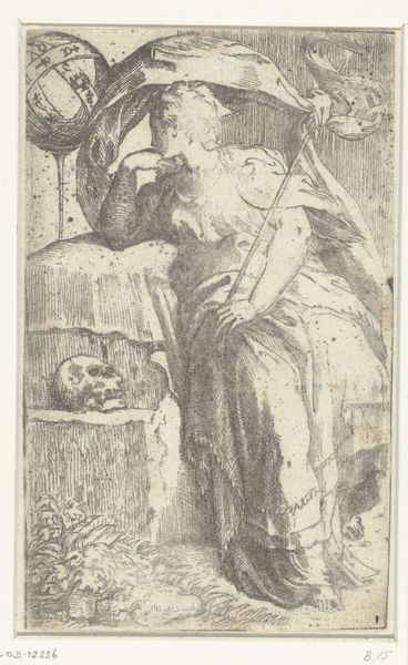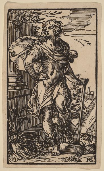 Curator: Let’s take a look at Nicolaas Hogenberg’s engraving, "St. Barbara," created around 1525. It currently resides here at the Metropolitan Museum of Art. Editor: The first thing that strikes me is her serene downward gaze—an air of acceptance. There’s also something very compelling about the rendering of light on her metallic armour versus the soft folds of her robe. Curator: The contrasts in texture really emphasize Hogenberg’s masterful technique with the burin and his attention to the process. These Renaissance printmakers were meticulous in their craft. It’s incredible to think of the labor and skill required to produce this image repeatedly, distributing it widely in its time. Editor: Absolutely. The tower looming behind St. Barbara, of course, is one of her key attributes. It represents her imprisonment by her father who was trying to shield her from Christian influences. What does it convey here, placed so centrally? It dominates the composition as her defining symbolic feature. Curator: And how would her father have gone about securing such a commission? How would Hogenberg negotiate such requests and demands in representing such subject matters, so intrinsically charged with political, social and, religious associations? Who were the artisans in his workshops, how were they compensated, and did the labor they provided differ with those by more recognized and reputable artisans? Editor: Interesting questions! For me, that tower whispers of resilience, and resistance. And also, her downcast eyes paired with the radiant halo suggest quiet contemplation amidst impending hardship. Perhaps the radiance promises an elevated future, post martyrdom? Curator: The halos from that period are fascinating, with each radiating lines precisely engraved on this print. One has to wonder how standardized they are, or are they personalized based on workshop conventions and commissions? Editor: Regardless, the details hold so much symbolic and emotional depth, offering clues into how Northern Renaissance audiences navigated their world. I love how art from this period demands a deeper symbolic reading! Curator: It all goes to show that careful consideration of technique and the tangible reveals that art production, dissemination, and use in the Northern Renaissance were deeply entrenched within networks of human activity and creative economies. Editor: Well, Hogenberg's "St. Barbara" certainly delivers that sort of historical potency and rich emotional weight in a deceptively simple, small format!