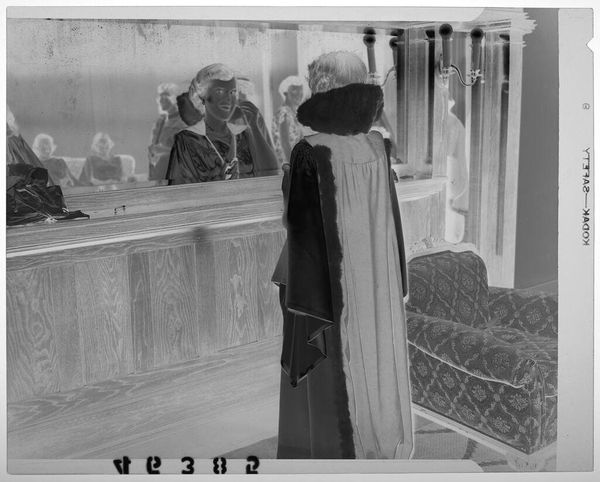 Curator: This untitled photograph by Jack Gould shows a woman kneeling to button a child's coat. What strikes you about it? Editor: The image feels quite tender, almost nostalgic, with its old-fashioned aesthetic. What social dynamics do you observe here? Curator: I'm drawn to the implicit narrative around care and labor. Consider the position of the woman, kneeling, often a posture of servitude. This act is also a tender interaction between generations. How might we read this photograph within a broader context of gendered expectations of women’s work? Editor: That’s interesting. I hadn't considered the labor aspect so directly. Curator: The everyday is always political. It shows the complex power dynamics embedded in our lives. Editor: I'll definitely keep that in mind moving forward. Thanks!
