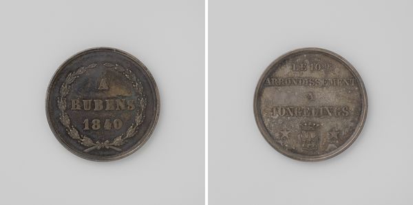 Editor: So, this is a bronze medal entitled "Stad Luik, penning uitgereikt voor moed en toewijding," created in 1828 by Léonard Jéhotte. The inscription hints at something meaningful, but honestly, it feels quite austere at first glance. What do you see in this piece that I might be missing? Curator: Austere, yes, but also incredibly powerful, isn't it? I see a tangible object steeped in the values of its time – Neoclassicism, which revered ancient virtues. Notice the circular form, a symbol of wholeness and enduring merit. The wreath, though simple, speaks volumes about honor and recognition. Do you think this item carries echoes from antiquity or revolutionary upswell? Editor: I see your point! Now that you mention it, there's something inherently noble in the design, like a Roman coin or something from the French Revolution. So, it's more than just a metal disc; it’s a miniature monument to bravery? Curator: Precisely! It encapsulates a civic ideal. Jéhotte immortalizes the city's values: courage and devotion. I bet you anything it offers glimpses into the world from when it originated, filled with civic pride and burgeoning national identities. Editor: It’s fascinating how a small object can reveal so much about history. It feels a bit less austere and bit more special. Curator: Absolutely, it is more special, a silent testament to the ideals we can strive for! Don’t you agree that this medal isn’t just about the past but is really timeless? It calls on values still worth thinking about and celebrating. Editor: Definitely! Looking at it this way, the medal suddenly has so much more resonance. It’s not just an artifact but a narrative.