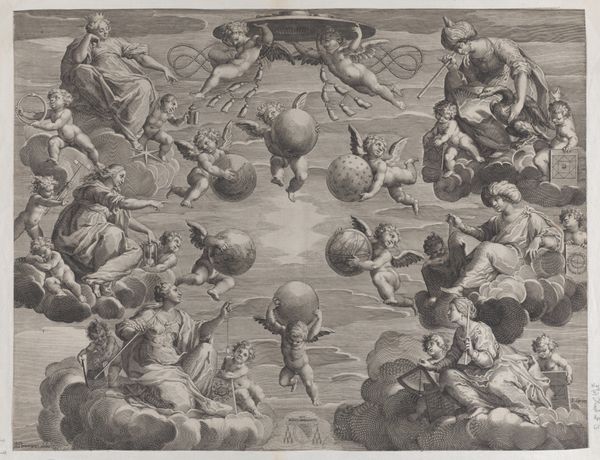 Francesco Faraone Aquila created this print, "Koepeldecoratie met oudtestamentische figuren en engelen", using etching techniques. The print's appearance is defined by the linear quality that is created when the artist scratches lines into a metal plate, applies ink to the plate, and transfers it to paper. This is a process of multiplication, and these prints would have been relatively accessible as devotional or decorative objects. The controlled, precise, and skillful lines create the texture, weight and form of the clouds, figures, and draperies depicted. Consider the labor involved. Beyond Aquila, there would be people responsible for pulling the prints. There are deep traditions of printmaking as a skilled craft. But prints like this one also belong to the history of the mass production of images, and their widespread consumption. Understanding the material and its making helps us to grasp its cultural importance, questioning what we consider to be fine art.
