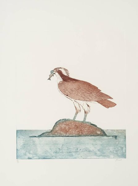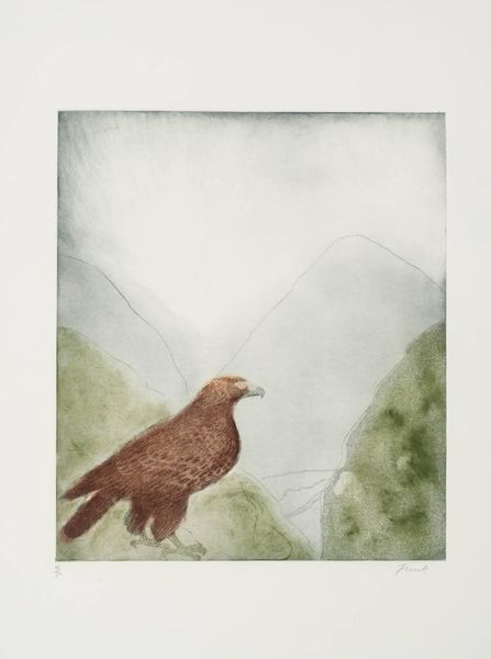 Curator: This is "Lammergeier" by Dame Elisabeth Frink, part of the Tate collection. Frink, born in 1930, was fascinated by birds, especially those with powerful presence. Editor: Oh, wow. It's... intense. The bird dominates, but it's also so fragile-looking, almost a ghost of itself. Curator: Indeed, the Lammergeier, or bearded vulture, often symbolizes resilience and adaptability. Its association with mountainous regions also evokes endurance. Editor: The washes of color give it an ethereal quality, like a memory. It almost feels medieval, with that fierce gaze. Curator: Frink often used animal subjects to explore human anxieties and power dynamics. Notice the bird's stance—assertive, yet somewhat vulnerable. Editor: It's interesting how she captures both the strength and fragility. I keep thinking about how its also called ossifrage, bone-breaker! Curator: Exactly. A testament to nature's complex balance. Editor: It certainly leaves a lasting impression. I'll be thinking about that bone-breaker for some time.