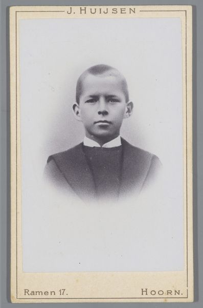 Curator: Well, hello! Let's explore this gelatin-silver print currently housed in the Rijksmuseum, a portrait simply known as "Portret van een onbekende jongen," by Albert Greiner. It’s dated sometime between 1874 and 1887. My first impression is quiet introspection, almost melancholic. Editor: Yes, I immediately notice the restrained palette. The tonal gradations in the brown hues certainly convey a somber, almost sepia-toned nostalgia. Look at how the light catches the young man's face, yet recedes into the dark depths of his jacket. Curator: Absolutely. That subdued color scheme echoes the emotional reserve so characteristic of the period. His crossed arms, while perhaps meant to convey self-possession, might also suggest vulnerability, a protective stance in the face of the unknown adult world awaiting him. The chair looks almost throne-like, conferring power, while simultaneously dwarfing him. Editor: An astute observation. It strikes me that the photographer makes strong use of geometry; see the tight, closed triangle his arms form. It mirrors and reinforces the formal, rigid expectation put upon young men of the era, visually representing societal constraints and their symbolic effects. Curator: Precisely! And notice the subtle detail of his necktie – barely a flourish amidst the severe dark suit, yet a signifier of aspiration. It suggests his possible belonging to the rising middle class and embodies bourgeois expectations and propriety of the time. A young boy at the dawn of the industrial age. Editor: Agreed. Even the framing, the sharp rectangular border, traps the image, mirroring how social structures confine. This aesthetic enclosure creates a sense of contained, almost suppressed energy, focusing us directly on the subject’s guarded, yet observant face. Curator: Indeed. What began as a seemingly straightforward portrait opens up onto multiple interpretations. The portrait captures the tension between private identity and imposed societal roles. Editor: By directing us toward this singular photographic image, we begin to decode an individual through a period in time, with codes available for constant decoding and application in our time. Curator: A worthwhile reflection for us today, offering up the value of empathy by allowing us to reflect on the challenges and aspirations of a young man now lost to time. Editor: A thought provoking conclusion indeed. Let us journey onward!