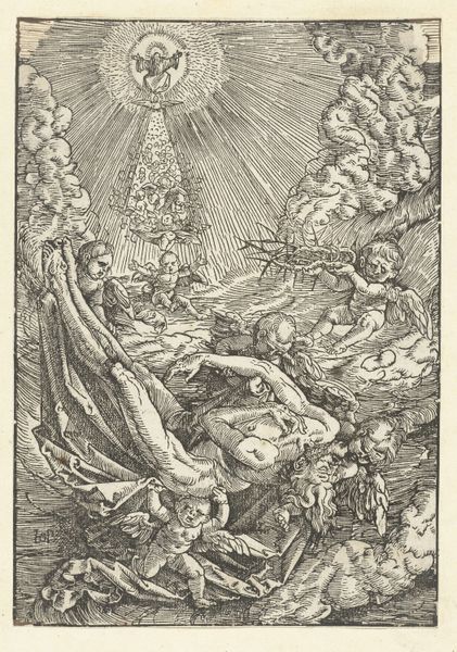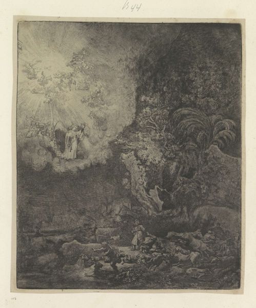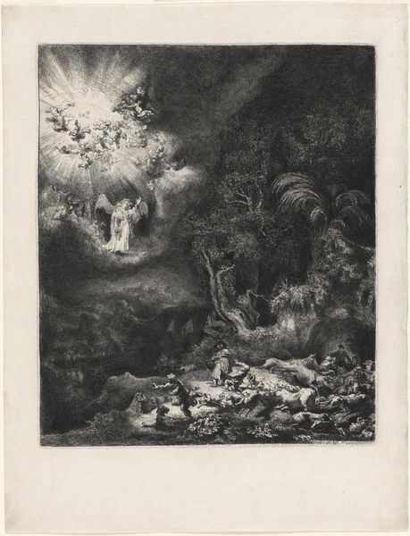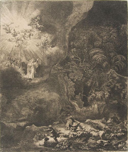 Curator: Rodolphe Bresdin's "La comédie de la mort" is a complex, densely detailed etching, a miniature world teeming with life and death, rendered in incredibly fine lines. Editor: It’s powerfully macabre. I’m immediately struck by the contrast between the skeletal figures cavorting in the trees and the figures huddled in apparent despair below. Curator: Bresdin often used such allegorical imagery. Skeletons symbolize, of course, mortality, but within a long tradition of memento mori, reminding us of the fleeting nature of existence. Editor: And the title suggests satire, a mockery even. Are we meant to laugh at this dance with death, or confront the social realities that make some lives more disposable than others? The figures at the bottom seem burdened by the weight of existence. Curator: Perhaps it's both. Bresdin was a visionary, often blending fantastical elements with poignant social commentary, reflecting the tumultuous times in which he lived. Editor: It feels like a challenge to the viewer, daring us to find meaning and connection within chaos, to acknowledge the disparities in the face of universal mortality. Curator: Indeed, a meditation on life's intricate ironies. Editor: A stark reminder of our shared fate, prompting us to consider what truly matters.