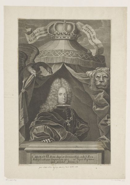Editor: So, this is "Portret van George William, Herzog von Liegnitz," made between 1684 and 1729 by Johann Tscherning. It's a print, an engraving, currently held at the Rijksmuseum. My first thought is just how ornamental everything is, and how it creates such a formal mood. How do you read this piece? Curator: Primarily, I'm drawn to the composition. Observe the sharp contrast of textures—the soft rendering of the ermine cloak against the hard, linear precision in the architectural elements. And how the draped fabric above frames the subject, while echoing his relaxed yet assured posture. Do you see how the gaze of the subject meets the viewer, creating an immediate connection despite the distance of time? Editor: I do, but I also see the throne he’s sitting on with these… are those lion heads? They seem so out of proportion! Curator: Consider then how the engraver uses this deliberate distortion. The disproportion serves not to mimic reality, but to heighten the sense of power and spectacle. The lion heads, grotesque in form, act as symbolic guardians, reinforcing the Duke's status. They draw our eye, create a certain tension and prevent us from perceiving this as a conventional portrayal of authority. Editor: So it’s less about an exact representation and more about what the artist is trying to communicate through these exaggerations? Curator: Precisely! It is the visual relationships, not realistic depiction, that generate the artwork's intrinsic value. It directs us away from questions about resemblance, and towards considerations of its structure and design. Editor: I never thought of it that way! Looking closer, I see how every detail contributes to a unified, symbolic whole, from the angle of his gaze to those almost comical lion heads. It seems like a visual puzzle, waiting to be decoded. Curator: Exactly, and it's the decoding that allows us to see its purpose and appreciate the complexities of art making.