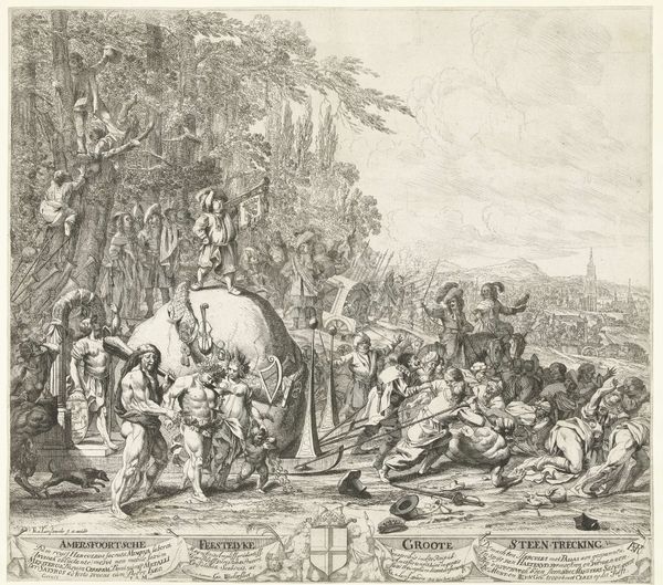 Curator: This print, “Verminking van de lichamen van de gebroeders de Witt, 1672,” was created around 1728 by Bernard Picart and resides here at the Rijksmuseum. It’s a powerful example of narrative art from the Baroque period. Editor: It certainly is…Visually, it's a dense composition; the eye jumps between clusters of activity. The monochromatic engraving style lends it a stark, almost brutal feel, wouldn't you say? Curator: Absolutely. The brutal quality mirrors the historical context. The piece depicts the gruesome mutilation of Johan and Cornelis de Witt, two Dutch statesmen, by an enraged mob in 1672. It is important to remember the impact on their family, particularly as Cornelis' daughter, Willemina, became a vocal defender of her father. Editor: One is immediately struck by how Picart uses the crowd as a compositional tool, funneling the viewer's attention towards the central act of desecration. There’s an unsettling symmetry in the arrangement of bodies. Curator: The city in the background seems deliberately indifferent. This highlights the lack of intervention and the broader societal implications of mob violence and political instability. The act becomes a metaphor for a society turning on itself. Editor: Do you think Picart is trying to provoke a specific response from the viewer? The exaggerated poses and stark contrasts do seem to hint at a desire to shock. Curator: Yes, and to warn. There's a definite cautionary element to the image, reminding us of the dangers of unchecked power and the fragility of social order. We need to reflect upon what triggers individuals or groups to turn to acts of senseless destruction. Editor: The realism in the engraving contributes to its unsettling quality; it presents the event with almost forensic precision. It makes you wonder how he captured the light falling in certain planes with such limited gradations. Curator: Well, Picart likely based his image on eyewitness accounts and existing depictions, synthesizing them into a cohesive and impactful visual narrative that serves as both a historical record and a social commentary. Editor: Looking at it through a contemporary lens, it encourages me to question how acts of violence—and our perceptions of them—are mediated and framed through visual representation. Curator: Indeed. The piece speaks volumes, reminding us of how crucial understanding the past is, and how collective violence is never disconnected from individual tragedies and experiences.