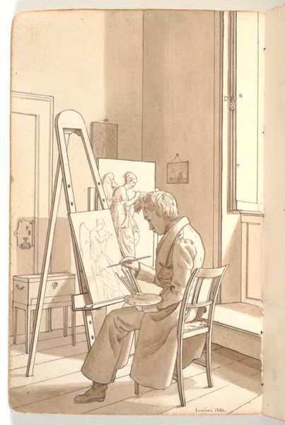 Martinus Rørbye made this watercolor in 1829. It gives us a glimpse into the artistic education of the time, showing young artists at the Royal Danish Academy of Fine Arts. The Academy played a crucial role in shaping artistic styles and values. The students are drawing from plaster casts, a common practice. This exercise encouraged a focus on classical forms and ideals. Note also the framed landscape on the wall, it reflects the growing interest in landscape painting, a trend tied to emerging national identities. The relatively informal composition may reflect the shifting social status of the artist, who was once seen as a craftsman. Now artists were becoming seen as intellectuals. To understand this artwork better, consider the Academy's curriculum, the social status of artists in Denmark at the time, and the influence of the German Romantic movement. Art is always contingent on its social and institutional context.