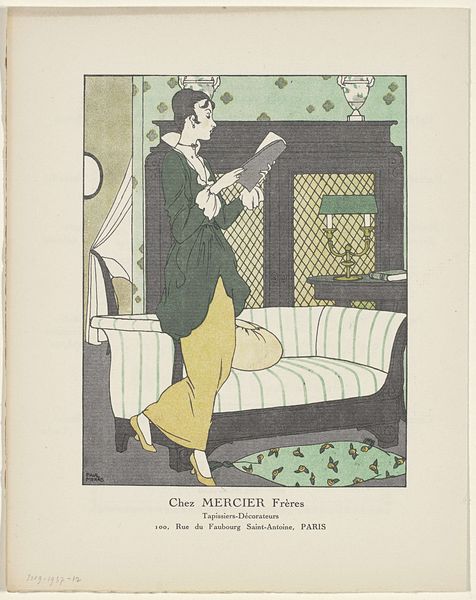This print, made by Paul Méras for the Gazette du Bon Ton in 1914, is all about the subtle dance between color and line. The way he uses this limited palette of blues, grays, and yellows is so clever. It gives the whole scene this quiet, almost dreamlike quality. The patterns, especially the polka dots on the woman’s dress, feel playful. The printmaking process here is so evident, you can almost feel the pressure of the block on the page. Look at the linework, notice how it's not trying to hide itself. It's confident, a little quirky, and totally part of the artwork’s charm. The color palette reminds me a lot of the work of Pierre Bonnard, with it's muted, intimate scenes. It’s this acceptance of process that gives the image its unique character. It's not about perfection; it's about embracing the imperfections and letting them be part of the story.