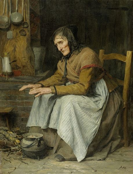 Curator: Look at this peaceful domestic scene—it's Gerrit Zegelaar's "Interior with Nursing Mother" from around 1774. It's got such an intimate, quiet feel, don't you think? Editor: Absolutely, that's the immediate vibe! The composition feels carefully constructed; it is almost theatrical, reminiscent of Vermeer but with this soft, diffused light that almost melts the figures into their surroundings. Curator: Yes! And it really makes you consider what’s happening just beyond the frame. Is that window illuminating this ordinary space with the light of some secret paradise? You notice how he subtly incorporates the Dutch Golden Age conventions of light and composition. Editor: Speaking of light, notice how Zegelaar strategically uses diagonals? The tiles, the window, the drape over the laundry basket – they create vectors guiding your eye around and ultimately back to the central Madonna figure. The colour palette further reinforces this hierarchy. Curator: That makes me think about the cat! He has subtly given the subject's space over to the animal who peacefully has lunch by her feet. Is that supposed to imply the woman’s acceptance of this lifestyle? Editor: Could be a broader reference to "natura naturans," representing the creative principle inherent in the natural world... Or simply the humble cat completes this Dutch interior with that Baroque touch? Curator: Maybe it just brings life to the scene! What else did they have to work with for visual stimulation? Editor: Possibly true! Although, structurally, it would still complete that crucial foreground and establish scale through contrasting textures—woven basket, sleek tile. It shows how humble objects compose an image in domestic interiors. Curator: This scene offers a glimpse into motherhood during the 18th century, something familiar across cultures and time. This is what makes it really special and universal for visitors. Editor: I agree. It's a testament to Zegelaar's ability to fuse form and meaning. It shows a new way to understand composition, narrative, or even motherhood. It does stay with you somehow, doesn’t it?