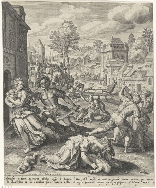 Curator: Ah, here we are. Before us is Johann Sadeler I's "Stoning of Saint Paul," an engraving dating back to 1580. Editor: Whoa. Brutal. Right off the bat, this piece just feels… violent. So much action, so many figures. It’s overwhelming, really, and makes my stomach churn. Curator: Indeed. Observe the meticulously rendered musculature of the figures, their poses dramatically contorted. Sadeler uses strong contrasts to emphasize the brutality of the scene. Consider, too, the architecture; it grounds the religious subject matter within a recognizable Renaissance idiom. Editor: Totally, there's that classical Italian feel, almost like a stage set. All that stonework, those heavy bodies. And everyone’s gaze is focused… not on Saint Paul, but the next strike! Ironic how static an engraving can feel so damned dynamic. It’s not just showing the stoning but this building feeling of frenzied rage. Curator: Precisely. Sadeler expertly employs the technique of chiaroscuro to heighten the drama. The strong shadows and highlights not only give depth but also serve to isolate and emphasize key figures and elements within the composition, especially the contrast of dark and light. Editor: It makes me wonder about Sadeler. Did he believe in what he was showing, or was this just, like, a technical exercise for him? Did he realize this could just stir up anger about violence? It does that to me now, I know that much! Curator: One can only speculate, of course. But his masterful command of engraving techniques underscores the prevailing artistic values of his time, privileging technical virtuosity and narrative clarity above all else. It’s fascinating to deconstruct his intentions in relation to period values. Editor: Still, as pretty as it is—or technically skilled, or whatever—there's something deeply unsettling about it. I mean, look at it—it makes you feel something, right? Maybe that’s the point? I can’t stop thinking how powerful imagery can be. Curator: Indeed. "The Stoning of Saint Paul" compels us to confront the complicated nexus of violence, faith, and artistic representation, regardless of our immediate reactions. It's a piece that continues to challenge and provoke contemplation centuries after its creation.