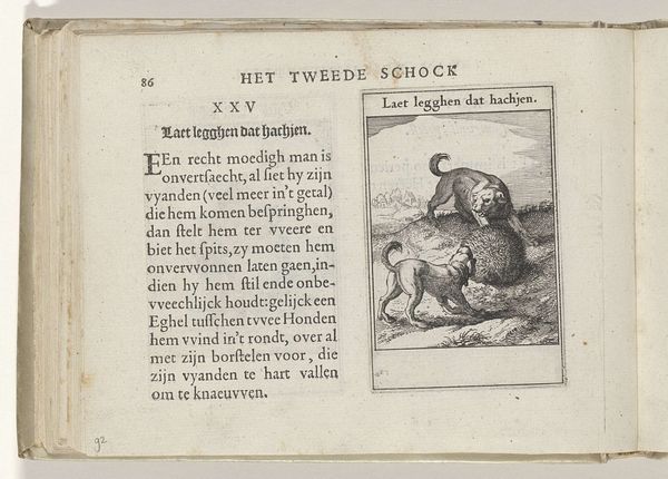 Editor: This is “XXVIII Schadelijck, nimmer schoon” from 1614, a print by Roemer Visscher currently housed in the Rijksmuseum. It's a depiction of a stag looking at its reflection in water, and it feels… almost melancholic. The starkness of the engraving contributes to that feeling, I think. What strikes you when you look at it? Curator: As a historian, I immediately consider the cultural context of such an image. Visscher was working in a time of immense social and political change in the Netherlands, so how did printed imagery such as this interact with a public audience? This piece is also very interesting to me because of how it intersects the narrative of a vanity piece with printed media. Considering print's relationship to the public as a mass medium, in your view, would a viewer in 1614 find this piece and its vanity implications critical, accessible, or both? Editor: I think the moral message would definitely be accessible. Vanity, as a vice, wasn't exactly a new concept! But, whether the public truly *internalized* that message is debatable, right? It’s easy to see the stag’s flaw without examining our own reflections, so to speak. Curator: Exactly. And that tension between accessibility and critical self-reflection is, to me, where the enduring power of this piece lies. It provides a point of contemplation for individuals navigating a society increasingly shaped by visual culture. Were people able to afford to purchase this, do you imagine? Editor: Based on what I remember from material culture classes, prints were relatively affordable, weren't they? Which means it had a potentially wide reach! I hadn’t really considered that dynamic before; I was too focused on the artistic components. Thanks! Curator: And I suppose I should look at art for art's sake more often! Always a balance, isn't it?