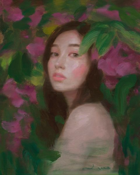 Editor: So here we have 'Blooming,' an oil painting by Joseph Lorusso. I'm immediately drawn to the intimate and almost vulnerable gaze of the subject, and how the soft brushstrokes create this dreamy, almost ethereal feel. What do you see in this piece? Curator: Ah, yes! Dreamy is a great word. It’s like a memory unfolding, isn't it? Lorusso has captured a fleeting moment with such sensitivity. I'm struck by the juxtaposition of the realism in her features and the abstract quality of the background— those paint drips, like tears or pollen… Do you see how that tension creates a feeling of…longing, maybe? Editor: I do. It’s like she’s present but also fading. What do you think that contrast says about Lorusso’s message? Curator: Well, I feel he's capturing the ephemeral nature of beauty, the transient quality of youth. Perhaps even the internal blossoming of potential – hinted at by the title. Look at how he's used color, these warm peaches and rose tones. It’s like capturing a feeling rather than just a likeness. Does it make you think of any particular artist or movement? Editor: Maybe some of the Impressionists, but with a more contemporary feel, especially in the raw edges. Curator: Precisely! It is as if the canvas has not quite caught up to the emotion of the piece. You have a great eye. It's lovely when something appears unfinished; there's space for the viewer to bring themselves. Editor: I’m really appreciating how much a single portrait can communicate! Curator: Me too. It reminds me of a quote by Degas: “Art is not what you see, but what you make others see." Something for us to keep in mind, I think!