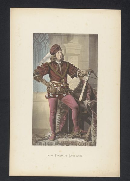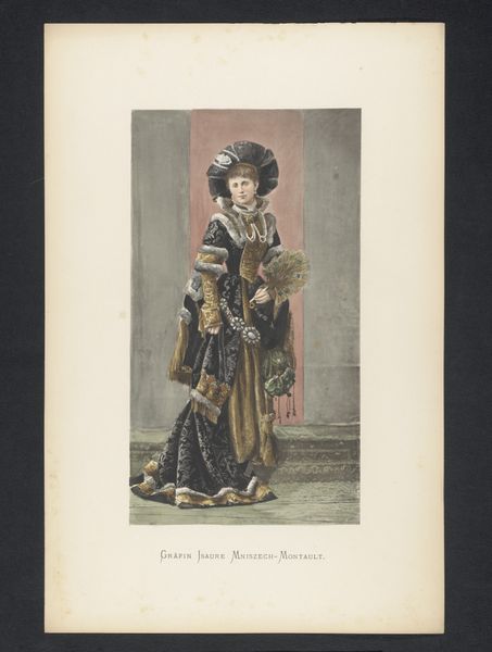 Curator: Look at this arresting portrait! "Portret van gravin Alice de la Fontaine et d'Harnoncourt-Unverzagt," likely created between 1880 and 1884. The artist chose colored pencil to capture this woman, an aristocrat of the time. What's your initial reaction? Editor: There's such richness of detail in the textures of the fabrics and ornaments. The sheer labor of layering those pencil strokes to evoke brocade and jewels—it’s a testament to painstaking skill and material knowledge. Curator: Indeed! Consider Alice within the constructs of 19th-century nobility. She isn’t merely a face; she represents lineage, societal expectations, and the performance of her class identity. Editor: The rendering is beautiful but there’s something posed about it, a very constructed reality being presented through the craftsmanship. It speaks to the elite consumer class and their reliance on commissioned art. What was it made for? What was the social value? Curator: Precisely! It echoes feminist critiques about women being ornamental objects, subject to the gaze of the male artist and wider society. Note how she presents a rigid, almost militaristic demeanor. What does this convey about gender expectations of the period? Editor: The rigid pose definitely makes it appear constructed, almost like a stage set—lighting, props, actors carefully placed. Someone certainly thought a lot about the staging and then how it would be conveyed via these pencils to create this record of a moment and, indeed, a person. Curator: Layered within the artistic choices, we can unravel societal nuances of wealth, gender, and power relations of the period. The clothing’s elaborate design and texture is a visual testament to economic and social standing, isn't it? Editor: The value is embedded into every layer, every carefully drawn thread. What can it teach us about the networks of artisans required for production and consumption of items within elite Victorian life? Curator: This portrait opens dialogue around representation and agency during that time. There's much to examine regarding the intersection of art and societal power. Editor: Exactly—let’s remember that materiality and production aren't neutral but embedded within broader economic and social contexts, giving insight into historical consumer culture.