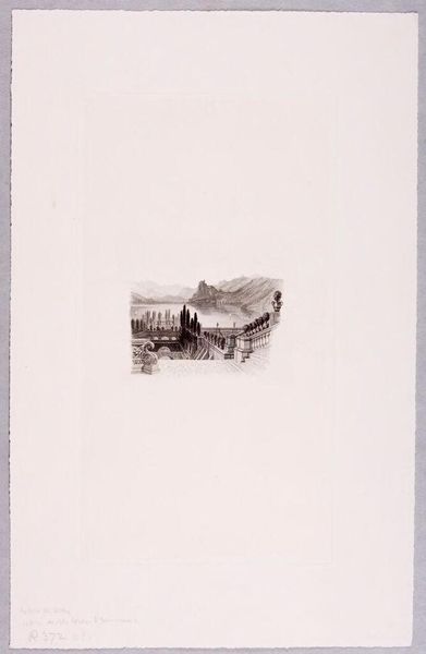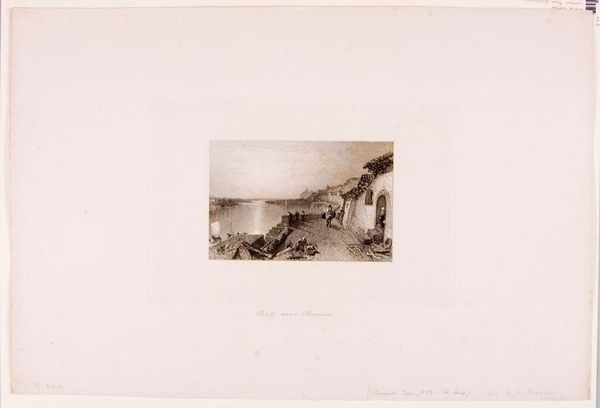 Curator: This is Robert Wallis’s print, entitled "Tours, Looking Backwards." Editor: It's quiet, almost dreamlike. The hazy quality creates a sense of distance. Curator: Indeed, Wallis uses delicate etching to render a river scene bustling with daily life. Notice the positioning of figures; Wallis depicts a group of people on the riverbank, looking towards a distant cityscape. Editor: The buildings mirror the curves of the river; it's about compositional balance, directing the viewer's eye. What about the social element? Who were the subjects meant for? Curator: Mass production of prints allowed for broader distribution of city views like this, fostering a sense of civic pride and a shared visual culture. Editor: It certainly makes us think about our current sense of place. Curator: I concur. It's a compelling echo through time.