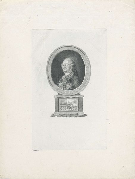 Curator: Let's talk about this print, "Portret van Maria Louisa van Hessen-Kassel," created by Reinier Vinkeles sometime between 1771 and 1816. It's currently held here at the Rijksmuseum. The work is an engraving. Editor: First blush? Regal. Like a slightly stern grandma about to dispense some incredibly wise advice, wrapped in an almost aggressively Baroque package. Those roses below feel...optimistic, I guess? Curator: "Regal" captures a crucial aspect of the piece, absolutely. Maria Louisa was a princess, and representations like these helped cement dynastic power, but also propagated gendered ideals of aristocratic femininity. How does her portrayal reflect that, in your view? Editor: The controlled chaos of the hair, for sure, and the way her garments drape, implying volume without revealing. A powerful ruler is embodied but not defined. Yet, there's also a certain frankness; the engraver doesn't soften or idealize every feature, which I kind of dig. The aged paper feels very tactile somehow, an element of truth showing the passing of time! Curator: Yes! And that 'frankness,' as you call it, walks the line between individual character and the requirements of formal portraiture. In many ways the artist negotiates political and aesthetic demands in representing the female body. But the image and object also speak to larger narratives of women, representation, and power in eighteenth-century Europe. Editor: Which makes you wonder about her actual story, beyond just being a "princess." Was she a rebel? A scholar? A gardener sneaking extra cuttings for the poor when no one was looking? Maybe. Curator: Or perhaps she was bound by a framework from which escape was never a true option. What intrigues you most as you reflect on this work now? Editor: I suppose the collision of the idealized container – the formal frame, the very technique of engraving – with something like raw human essence. It creates a poignant tension, almost as if she’s peering out, wanting to wink. Curator: It also underscores art's fascinating power to reveal not just an individual, but the societal forces that shaped their identity.