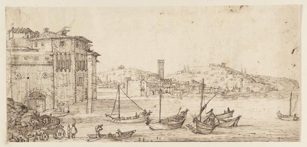 Editor: So, this is "English Yachts and Sloops on a River by a City", attributed to Willem van de Velde the Elder, created sometime between 1622 and 1693, using ink on paper. It feels very immediate, almost like a news sketch. What strikes you most about this piece? Curator: The rapid execution betrays the crucial function these drawings held in maritime commerce and naval power. Ink wasn’t just a medium here, it was a tool for documentation, mapping resources, recording ship designs. Did the artist have connections to the shipbuilding industry, the navy itself, perhaps even colonial enterprises? The economic conditions for production here are primary. Editor: That’s interesting. It gives a very different perspective to my impression that this was simply a scenic drawing. Do you see any connection between the types of ships depicted and the materials used to render them? Curator: Absolutely. Look at the contrast. The grander yachts are outlined with precision and detail. Ink was not inexpensive; this denotes those worthy of careful depiction because they hold material value as transport, war, or trade instruments. Editor: So the drawing isn’t just about the scene, but also a commentary on economic disparity as seen through these very different types of boats? Curator: Precisely! Van de Velde’s materials weren’t neutral; their use signals social stratification, marking differences in labour and resource access tied to shipbuilding. It speaks volumes about Dutch Golden Age economics. Editor: That’s a really insightful point. I will definitely look at drawings more critically going forward and ask questions about production. Curator: It’s a perfect place to begin with any work! Now the goal is to bring materialist inquiries with us to more artistic engagements, always.