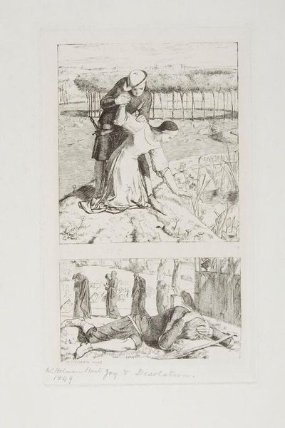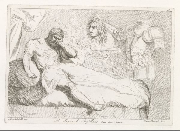 Curator: Here we have Benjamin West's pencil drawing, "Panthea Stabs Herself beside the Corpse of Abradatas," created sometime between 1738 and 1820. Editor: A truly tragic scene—it's raw, you can feel the characters' emotional turmoil etched right into the page through those lines. Curator: West was known for his large-scale history paintings. Yet, here, in this drawing, we see the intimate intensity he brings to the story, focusing on the very act and implements of its creation. Pencil, paper—readily available materials used to depict such profound emotional weight. How do the economical means affect the way we perceive this image? Editor: Absolutely, West stages it like a brutal theatre. It hits hard—the male figure reaching towards the dead couple could represent a patriarch reacting to an unthinkable outcome for his lineage and legacy, highlighting a power structure threatened by female agency. Curator: The quick, sketchy lines contribute to a sense of immediacy, almost like a news report of the time. And while the material seems humble, West's attention to detail—the drapery, the musculature—suggests a deep understanding of classical forms. This careful execution contrasts with the horror of the event. Editor: The dead soldier's discarded helmet and the female figure's stance highlight the social expectation of a noble death on the battlefield. Instead, Panthea takes control, making a conscious choice to wield the same weapon that brought her beloved to this end, leveling a battlefield that transcends mere militarism. Curator: There's a certain starkness to the scene because he chose to depict such high drama with just pencil and paper. It also serves to humanize these figures taken from antiquity or myth. It shows they, too, are subject to simple tools. Editor: This drawing opens a dialogue, then. We're prompted to question not just the "who," "what," and "where," but also the "how," and, more crucially, the "why." What drove West to extract such brutal agency and place it into the hands of his female protagonist, considering the historical gender context? Curator: Ultimately, this drawing makes a direct statement: even in its most basic material form, it offers both historical depth and a poignant connection. Editor: I’d add it underscores a silent scream—the quiet pencil lines can reveal far more than vibrant colors and oils might suggest. The raw immediacy lends greater power.