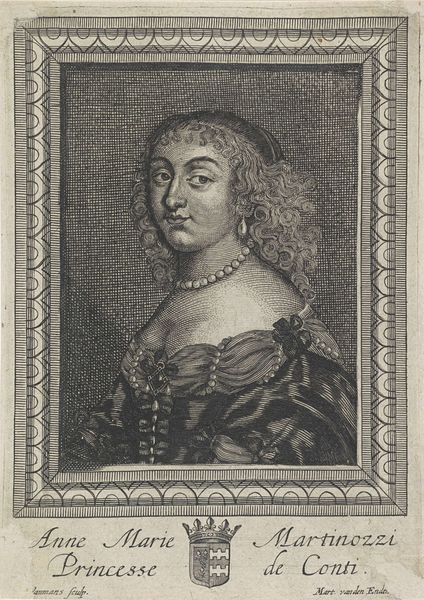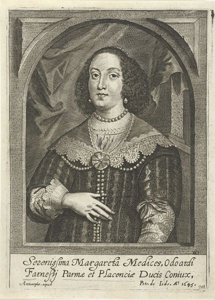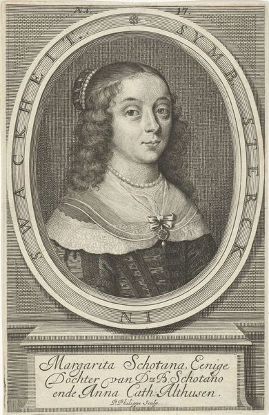 This print of a woman with a lace collar, pearl necklace, and curled hair was made by Wenceslaus Hollar in 1645. It's an etching, a process where lines are incised into a metal plate with acid, then filled with ink and printed. Hollar was a master of capturing textures, evident in the delicate lace and the sheen of the pearls, showcasing not just his skill but also the value placed on these meticulously crafted items in 17th-century society. The precise work involved in creating lace at this time mirrors the meticulous detail Hollar achieved in his printmaking. Consider how the labor-intensive process of etching is similar to that of lace-making; it’s a kind of proto-industrial skill, and demonstrates the cultural importance of fine craftsmanship. By focusing on such details, Hollar elevates the portrait beyond a mere likeness, to a comment on the material culture of his time.