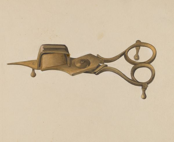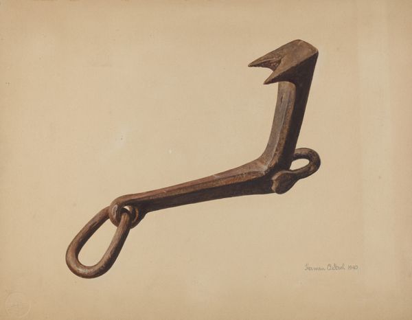 Curator: Alexander Anderson's "Handled Door Latch" from 1940 rendered in watercolor and drawing, an intriguing confluence of medium to portray a simple utilitarian subject. Editor: At first glance, it feels stark, almost lonely. It’s not just the subdued palette; the door latch depicted so plainly gives a sense of separation and stillness. Curator: Separation seems spot on! The very function of a latch is about controlling access and defining spaces, isn't it? Anderson isolates the object, urging us to focus on the beauty, labor and history embedded in the simplest mechanism. Editor: Indeed. Thinking materially, you see the craftsmanship involved in shaping the metal; and there's a narrative right there in the patinated metal. These aren't pristine surfaces; they tell stories of countless hands and movements over time, an interaction and reliance with the land. Curator: Exactly, It whispers stories, it doesn’t scream them, about lives and routine! You see how delicately the watercolor conveys the texture? Like capturing the soul of the steel rather than merely documenting its form! Anderson elevates something so easily overlooked. I find something profound in this quiet appreciation. Editor: That subdued quality gives it a powerful emotional resonance. What's intriguing for me is the blurring of art and object. It forces you to confront questions about utility, decoration, the hand made versus the manufactured – all while appreciating this detailed artwork as itself a singular and laborious object. Curator: It is about how this artwork allows something seemingly insignificant to reveal itself with grace and elegance; prompting introspection of overlooked moments and elements within our lives. It urges one to value labor, both physical and artistic, as interwoven. Editor: Agreed; it's that delicate balance—how the materials and social context inform both the art and our understanding.