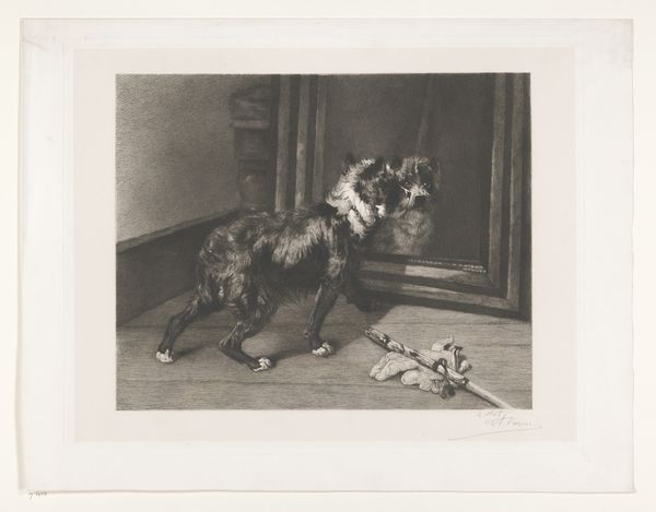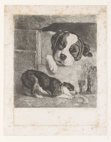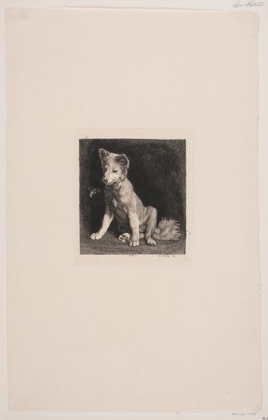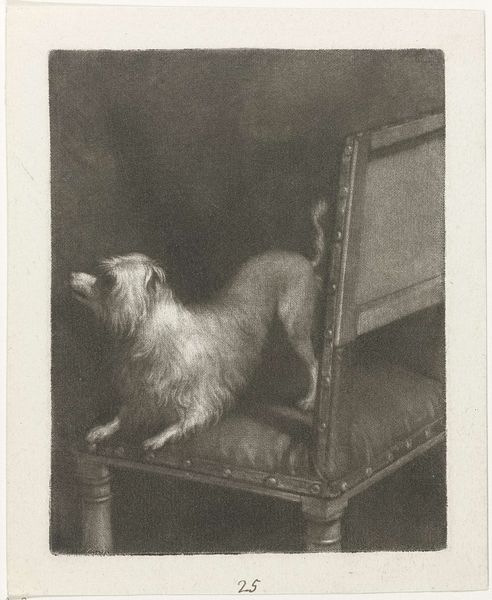 Curator: Welcome. Here, we see a charcoal drawing created by Jan (II) Verkolje in the period of 1683 to 1755. Its title simply states, "Hond, mogelijk een spaniël," or, "Dog, possibly a spaniel." Editor: Aw, look at that pose! Pure unadulterated doggy joy! He’s all stretched out, tail a-quiver, gazing at… a biscuit, maybe? I can almost hear the happy little yaps. Curator: The charm is undeniable, but let’s consider the formal elements. Notice the baroque dynamism achieved solely through charcoal. The contrasts are striking. Observe how the artist captures light, creating depth and texture. It transcends mere representation; it is the articulation of form through light and shadow. Editor: Absolutely, the charcoal work is exquisite – but there’s a kind of understated energy here that goes beyond just technique. The dog isn't simply "being"; he’s yearning, hoping, engaged. That arched back tells a whole story, doesn’t it? It almost feels like it defies the constraints of its era, leaning towards a realism tinged with humor. Curator: I agree that Verkolje infuses the figure with vitality, disrupting the conventions of typical animal portraiture from that time. The upturned gaze becomes the focal point. It implies an unseen element, which subsequently draws the viewer into the dog's perspective. The artist evokes a sense of shared experience. Editor: Exactly! It is all about a longing glance. And yet, rendered with the lightest, most skillful touch. You can almost feel the fluffiness of the tail and floppy ears. The sketch is deceptively simple, really. A few strokes and you’ve got a whole personality bursting through. What do you suppose the dog saw? Curator: Perhaps we will never know the exact nature of its yearning, but the composition leads us to speculate. Thank you for illuminating additional interpretive routes to appreciating the dog's gaze. Editor: It was my pleasure. I love finding hints of myself in the longings of a charcoal dog!