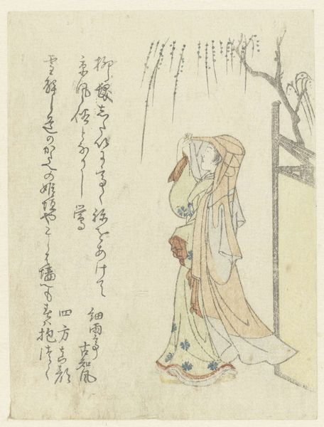 Curator: Katsushika Hokutai’s “A Woman Among Young Pines,” dating circa 1800-1805, immediately strikes one with its understated elegance. As a woodblock print, it's remarkable in its detail and subdued palette. Editor: Yes, I immediately note the tranquil and serene mood established by the soft hues. The composition—a figure positioned amidst rolling hills dotted with pine trees—creates an almost meditative effect. Curator: This piece exemplifies Ukiyo-e traditions by subtly exploring the ephemeral nature of beauty and the pleasures of daily life through its representation of a female figure—likely an urban woman from Edo. Note that she's not necessarily a representation of reality but is designed to present a contemporary ideal, reflecting the desires and projections of a specific consumer culture. Editor: Absolutely, and analyzing the formal elements, we see the expert handling of line to define form, from the gentle slope of the hills to the intricate patterns on the woman’s kimono. It's fascinating how such delicate linework can create such a strong sense of space and depth. I'm also observing how color is strategically deployed to accentuate certain details without overwhelming the composition as a whole. Curator: That’s precisely what makes this art historical context critical! Consider the status dynamics; a patron of this kind of work certainly was someone who sought to engage in contemporary narratives surrounding identity and gender through the art that they bought. What can the setting among young pines suggest about this female subject? Does this provide her with new roots, a symbol for resilience and enduring vitality? Editor: Intriguing question! Formally speaking, though, I see a strong counterpoint between the geometric patterning on her robe and the more organic forms of the landscape, suggesting an artificial imposition upon nature; something man-made versus the organic proliferation of nature, further reinforced by the clear hierarchy created, drawing all focus to the robe's color scheme, its texture and linear detail. Curator: A point well-taken! To step back and look more holistically, though, “A Woman Among Young Pines” transcends a pretty landscape piece to prompt larger conversations about class, environment, and perhaps the constraints of the Edo society. Editor: Indeed, through careful visual analysis alongside considerations about cultural and historical elements, there's truly depth here. Curator: A conversation we can explore together in future viewings!