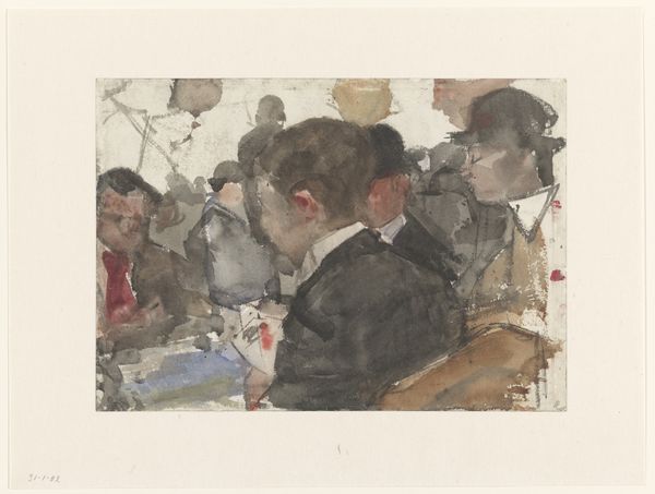 Isaac Israels made this small watercolor, "Kaartende heren in café," with watercolor on paper. Look at how Israels captures a fleeting moment with such economy! The watery washes create depth, while the dry brushstrokes add texture and definition. It’s like he's saying, "I don't need to spell everything out; the mood is what matters." The way the light catches the card player’s face, leaving the rest of the scene in shadow, is particularly striking. Israels uses the transparent qualities of watercolor to create a sense of atmosphere and intimacy. There's a kind of casualness to the way he applies the paint, almost as if he's sketching directly from life. This reminds me of Manet and Degas and their interest in the life of the modern city. Israels lets the painting breathe, embracing the beauty of suggestion over explicit detail. It’s a reminder that art can be about capturing a feeling, a moment, a vibe – rather than just a picture.